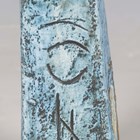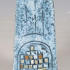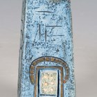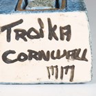 A Newlyn Troika Pottery Coffin Vase, 1970-83, with typical abstract relief decoration against a blue washed ground, black painted factory mark and monogram to base, height 16.5cm.