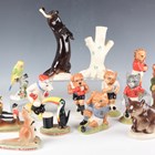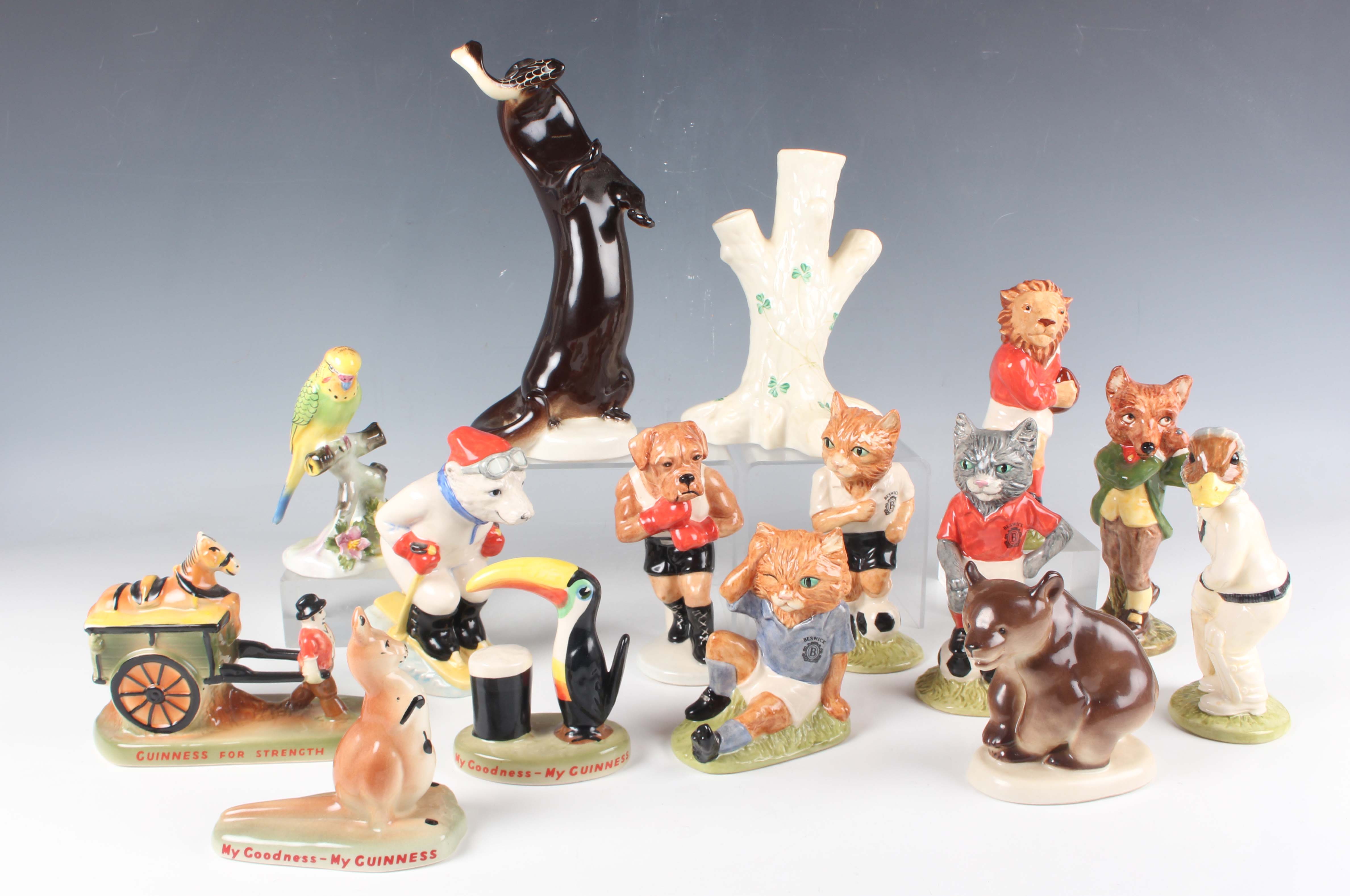 Five Beswick Sporting Characters Collection limited edition figures, comprising A Round With Foxy, Last Lion of Defence, Out For A Duck, It's A Knockout and Sloping Off, three Beswick Footballing Felines Collection figures, boxed with certificates, three reproduction Guinness figures, two Russian Lomonosov animals, a Royal Doulton Budgerigar and a Belleek spill vase in the form of a tree trunk.