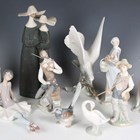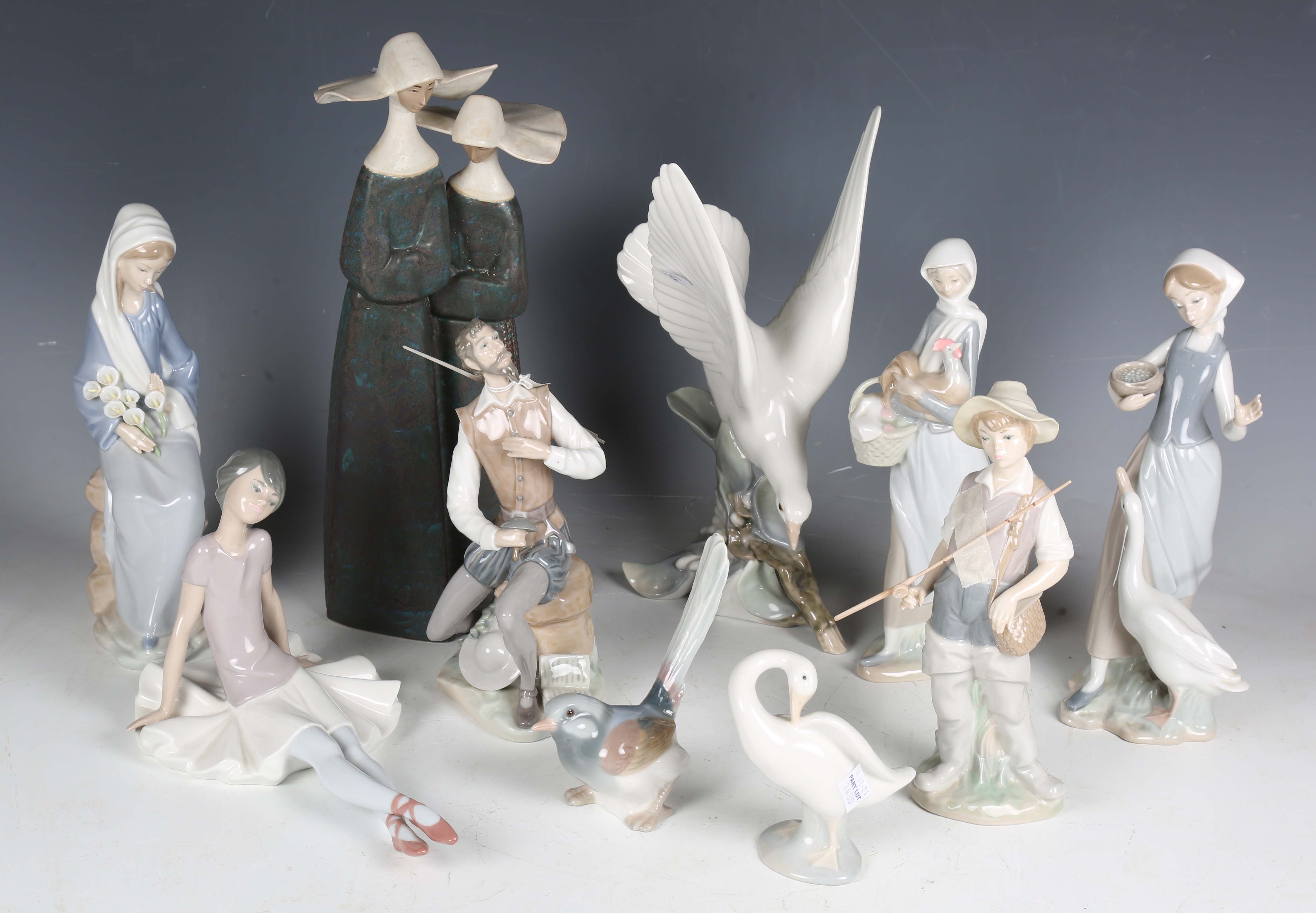 Ten Lladro ornaments, comprising Gres stoneware Nuns in a blue wash, No. 2075, Girl with Lilies, No. 4972, Turtle Dove, No. 4550, Fisher Boy, No. 4809, Don Quixote Oration, No. 5357, Phyliss Ballerina, No. 1356, a girl with a goose, a girl with a chicken, a small goose and a bird, some boxed.