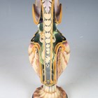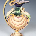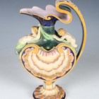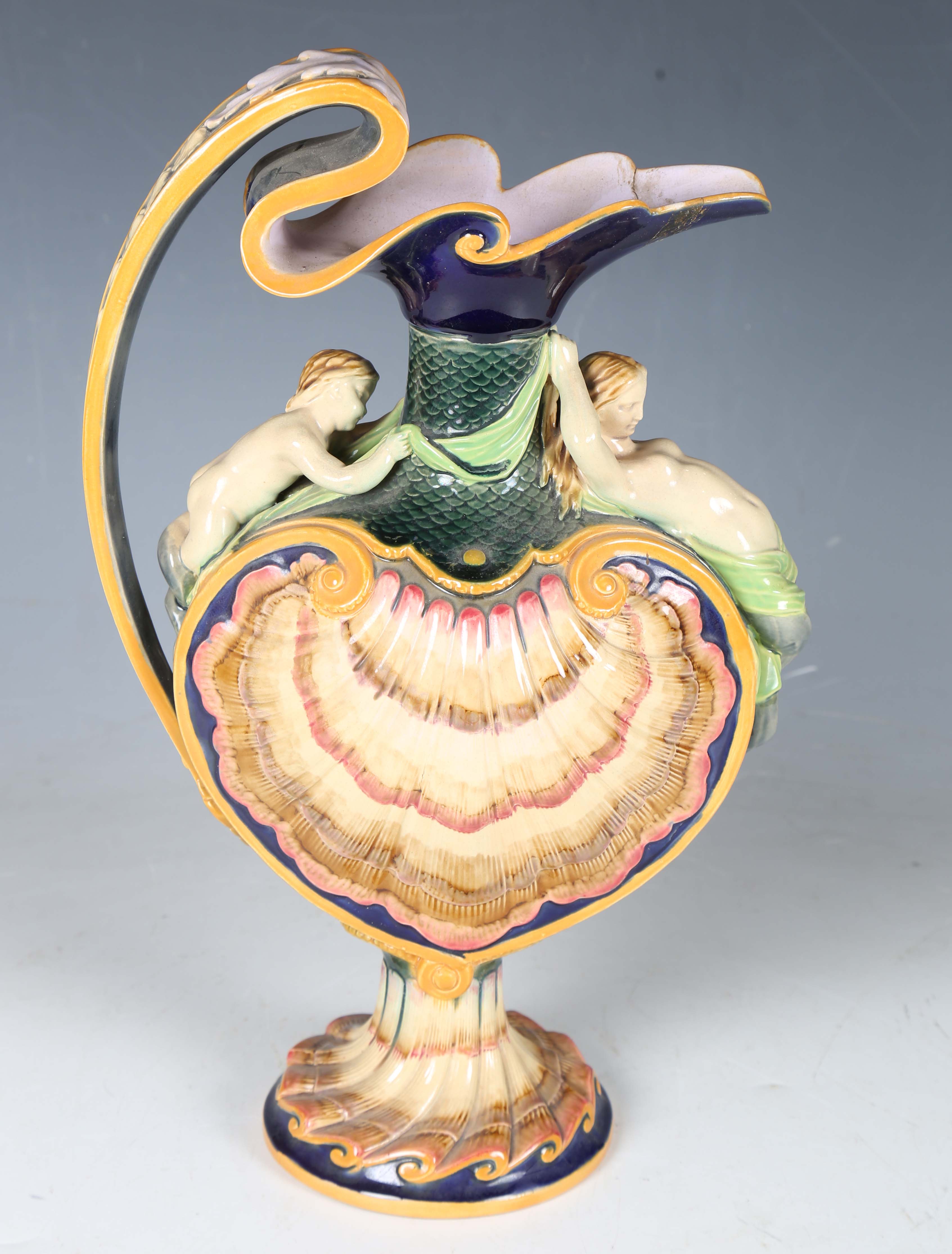 A Minton majolica shell ewer, modelled by Hugues Protât, dated 1867, shape No. 1136, the scallop shell body with fish scale ground, surmounted by a twin tailed mermaid beneath the spout and a similar young merman beneath the handle, raised on a shell moulded spreading circular foot, impressed factory marks to base and Protât monogram to base of handle, height 38cm (repair to spout).