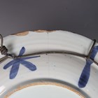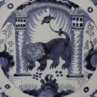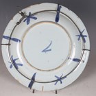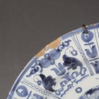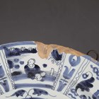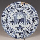 A Dutch Delft circular dish or charger, 18th century, painted in shades of blue in Chinese Wanli style with a central Lion of Judah motif within an alternate figural and stylized foliage panelled rim, the rim underside with blue painted dashes and crosses, diameter 30.5cm (faults).