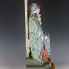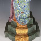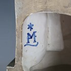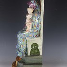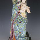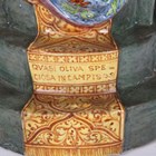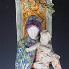 A large Angelo Minghetti Italian maiolica altar figure or group, late 19th century, depicting The Madonna of the Olives, the seated Virgin Mary wearing blue ground floral decorated robes, supporting the Christ child standing on her knee, her tall backed seat with a relief olive branch at the top, on a stepped base painted with a trompe l'oeil runner inscribed Quasi Oliva Speciosa in Campis, blue painted factory mark to reverse, height 62.5cm (some restoration).