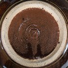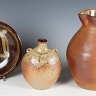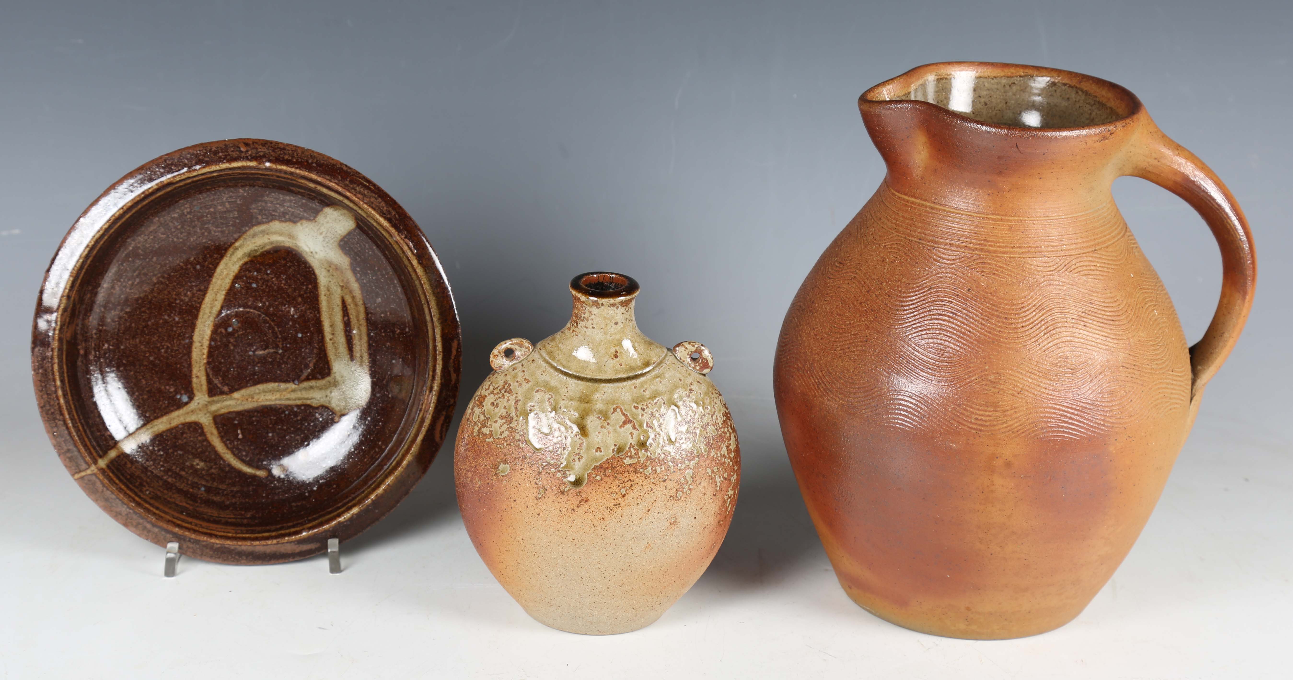 A Svend Bayer studio pottery wood fired stoneware jug, the top half of the unglazed exterior with an incised design of overlapping waves, unmarked, height 25cm, a small circular Wenford Bridge dish with brushwork on a dark glazed ground, diameter 20.5cm (minor chips), and a Muchelney pilgrim (costrel) flask, impressed mark to base, height 16cm.