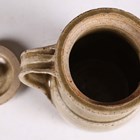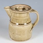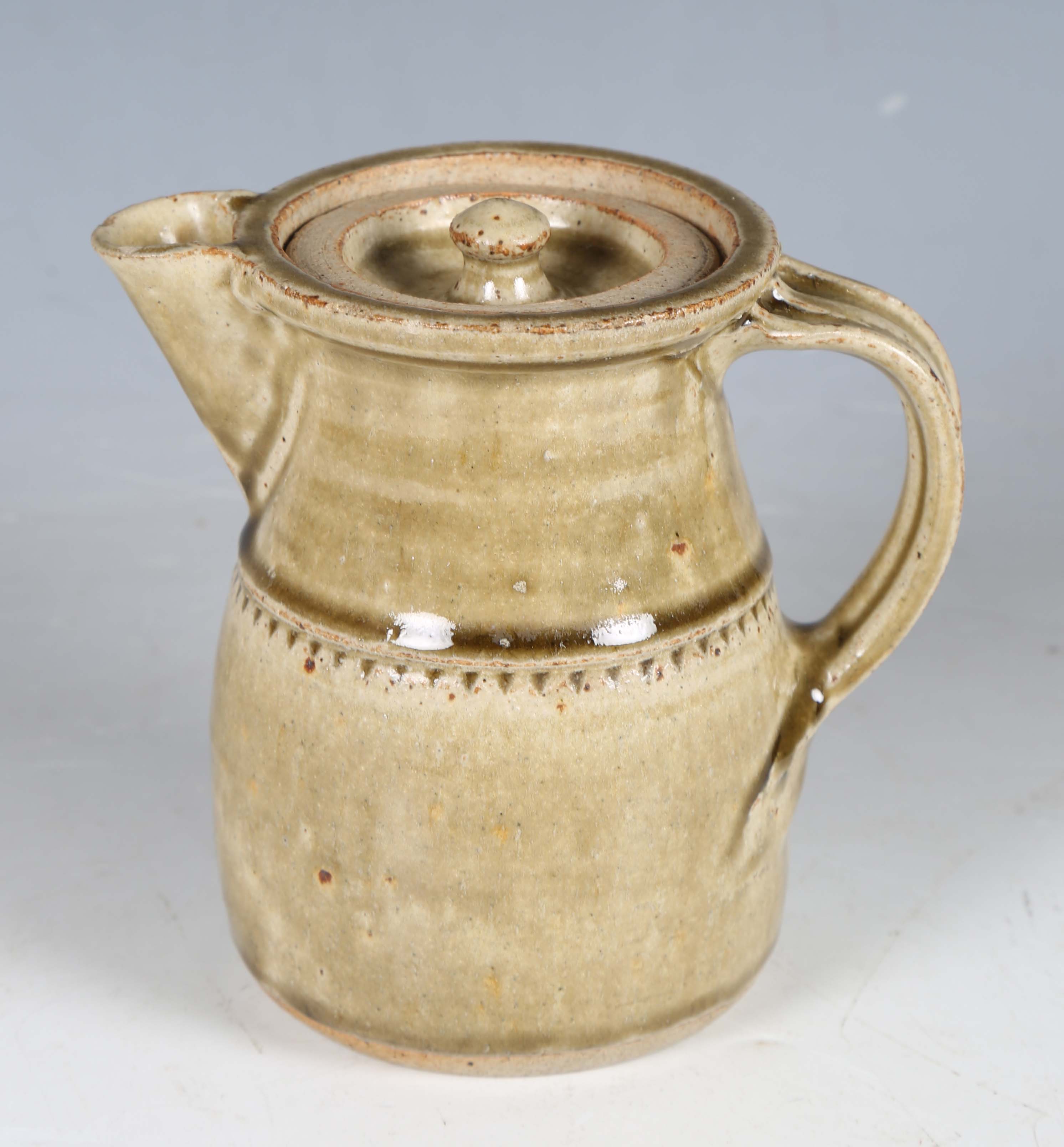 A Richard Batterham studio pottery stoneware coffee pot and cover, covered in an ash glaze and with a horizontal band of small impressed triangles running beneath the spout, unmarked, height 14cm (small chips).