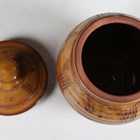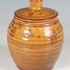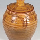A Clive Bowen studio pottery ovoid jar and cover, covered in a honey coloured glaze with a sgraffito pattern of vertical lines and stylized leaves to the upper exterior, impressed seal mark, height 13.5cm.