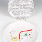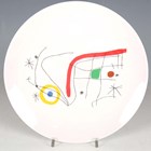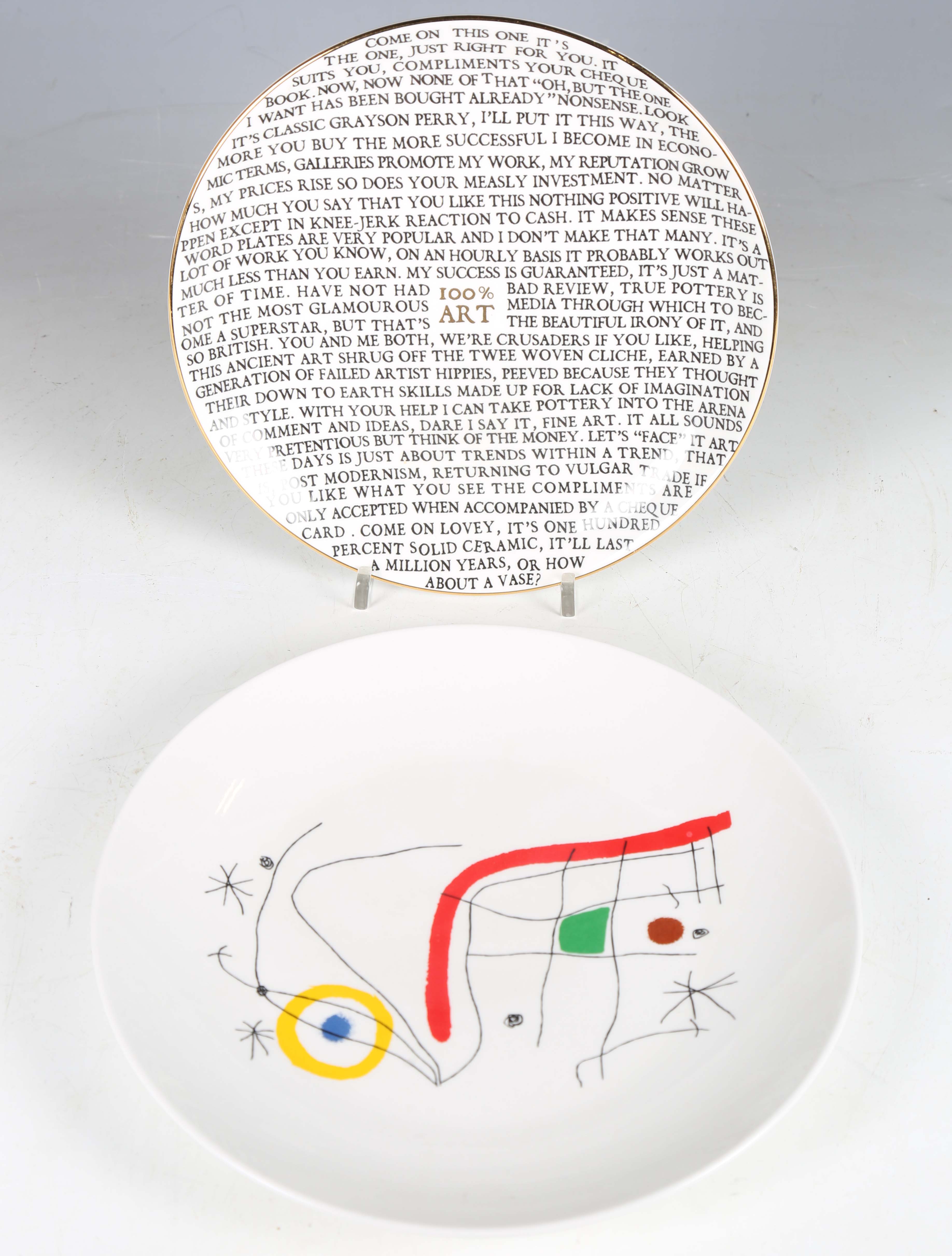A Grayson Perry 100% Art porcelain plate, made for the Sainsbury Centre, printed in black and gilt within a gilt rim, black printed mark to base, diameter 21.8cm, together with a Joan Miró plate printed with a design from their book L'Issue Dérobée (Hidden Exit), black printed marks to base, dated 2008, diameter 25cm.