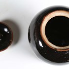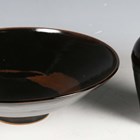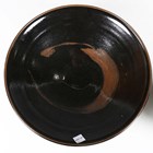 Two pieces of tenmoku glazed studio pottery, comprising a jar and cover by Andrew Marshall of high shouldered form with thumbprint details, height 14cm, and a flared circular bowl by Chris Carter with brushwork to the base interior, diameter 29.5cm, both with seal mark (minor faults).