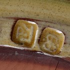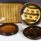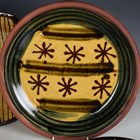 A Paul Young studio pottery circular dish, slip decorated with a geometric pattern of asterisk and lines, impressed seal marks, diameter 33.5cm, together with six Winchcombe type studio pottery dinner plates, unmarked, average diameter 26cm, and a Colonial Williamsburg Restoration 18th century style slipware baking dish, of rounded rectangular shape with combed decoration, impressed mark to base, length 41cm.