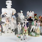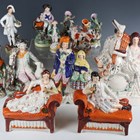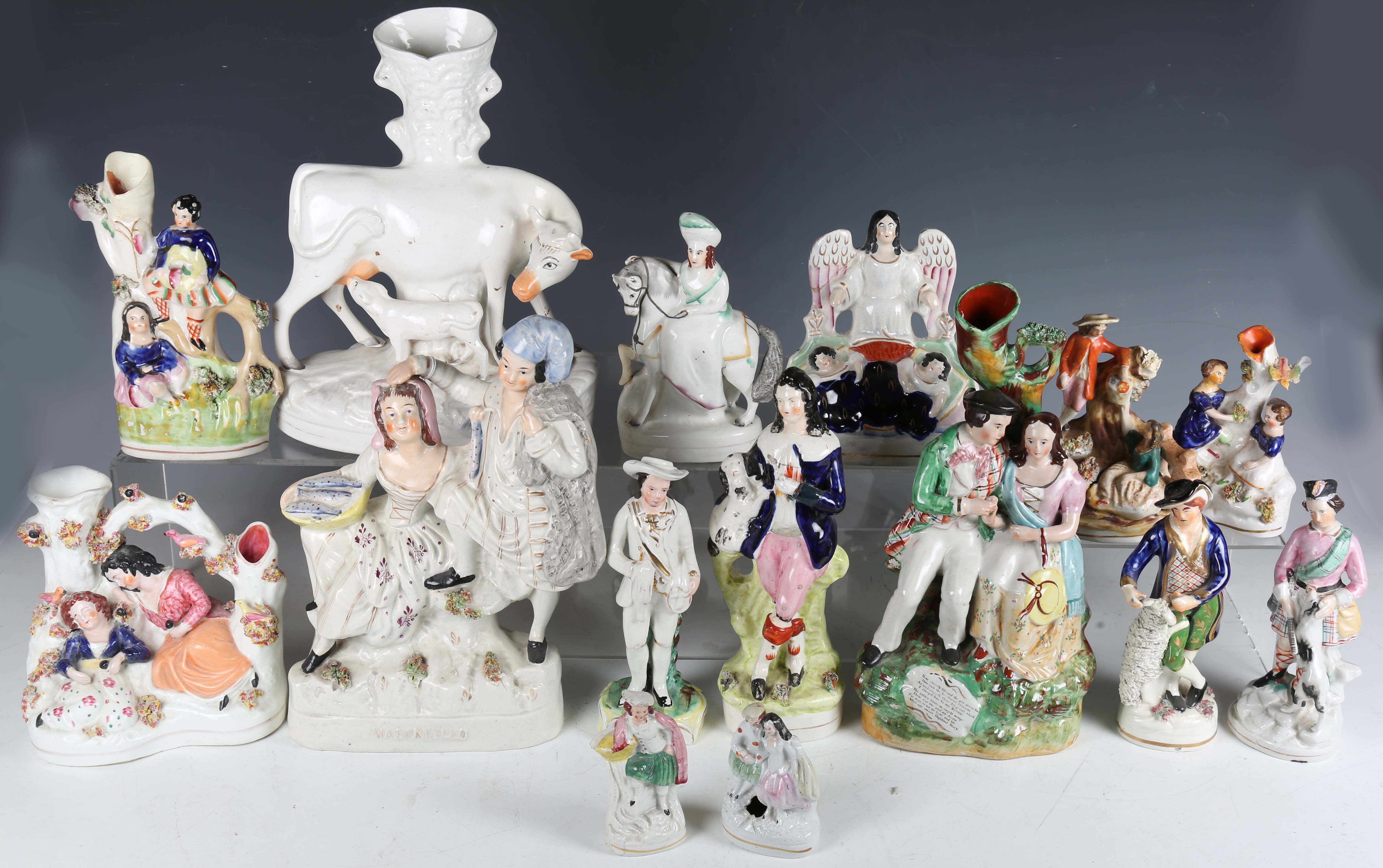 A large group of approximately thirty Staffordshire pottery figures, groups and spill vases, mainly 19th century, including a fisherman and his sister titled Masaniello, height 29cm, a clock face group with highland couple, height 36cm, a pair of musicians reclining on settee's, a huntsman with his dog, a male and female fish seller on a moulded base, height 28cm, a white glazed cow and calf crossing a stream spill vase group and a seated boy with a chained monkey, height 18cm (faults and repairs throughout).