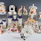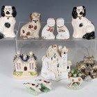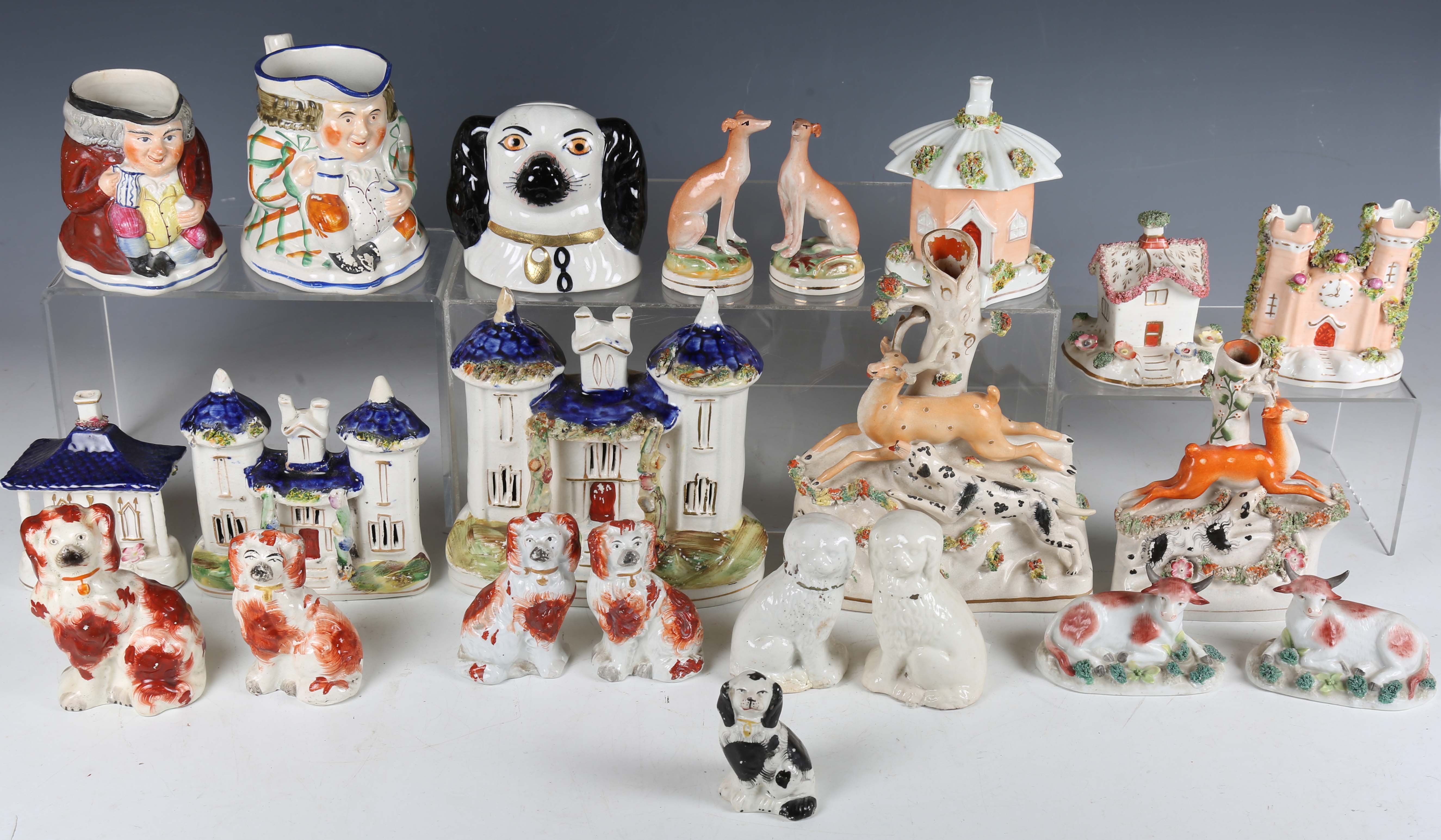 A mixed group of Staffordshire pottery houses and animals, mostly 19th century, including a pair of seated greyhounds on gilt lined circular bases, height 10.5cm, four small seated spaniels with rust coloured markings, tallest 11.5cm, a similar small black and white spaniel, a money bank in the form of a spaniel's head, height 10cm, two spill vase groups with dogs chasing deer, tallest 19cm, a castle shaped pastille burner, height 10cm, a similar pastille burner with octagonal roof, height 11.5cm, a graduated pair of buildings with blue glazed roofs and a pastille burner in the form of a cottage with applied flowers around its base, together with a small group of similar later wares, including a pair of Beswick black and white spaniels, height 14cm, a pair of Continental recumbent cows, length 9.5cm, and two jugs moulded as Toby's (faults and repairs throughout).