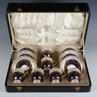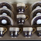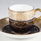 A cased set of six Royal Worcester coffee cups and saucers, dated 1931, with a green and yellow 'jewelled' foliate scroll and shell gilt border above a gilt overlaid and white 'jewelled' cobalt blue ground, puce printed, impressed and painted marks to bases.
