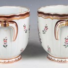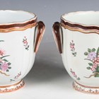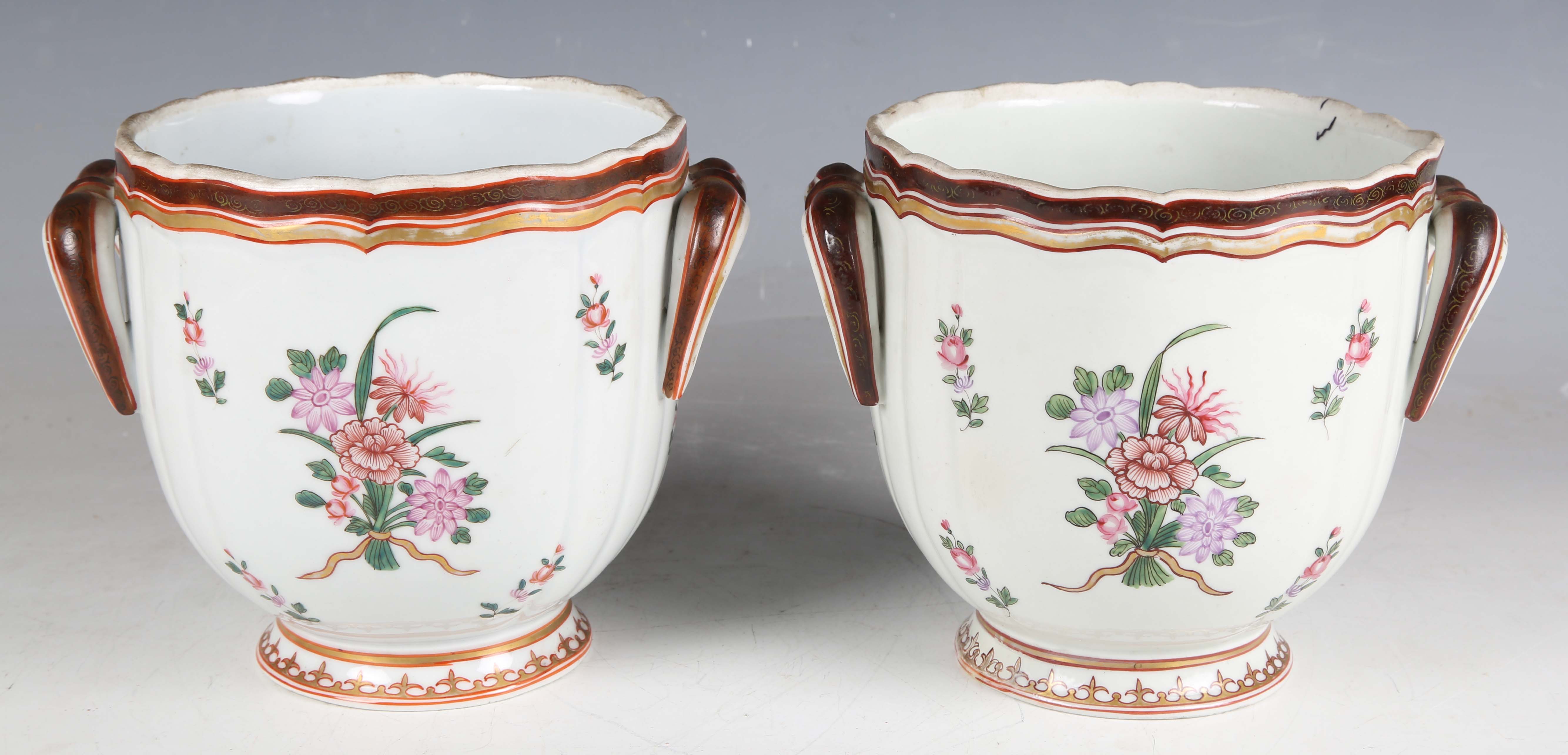 A pair of Samson porcelain two-handled jardinières, early 20th century, painted in Chinese famille rose export style with coats of arms opposing floral bouquets amongst scattered floral sprigs, unmarked, height 16cm (minor restoration to one foot).