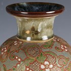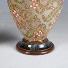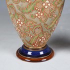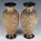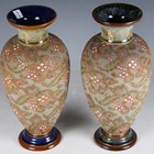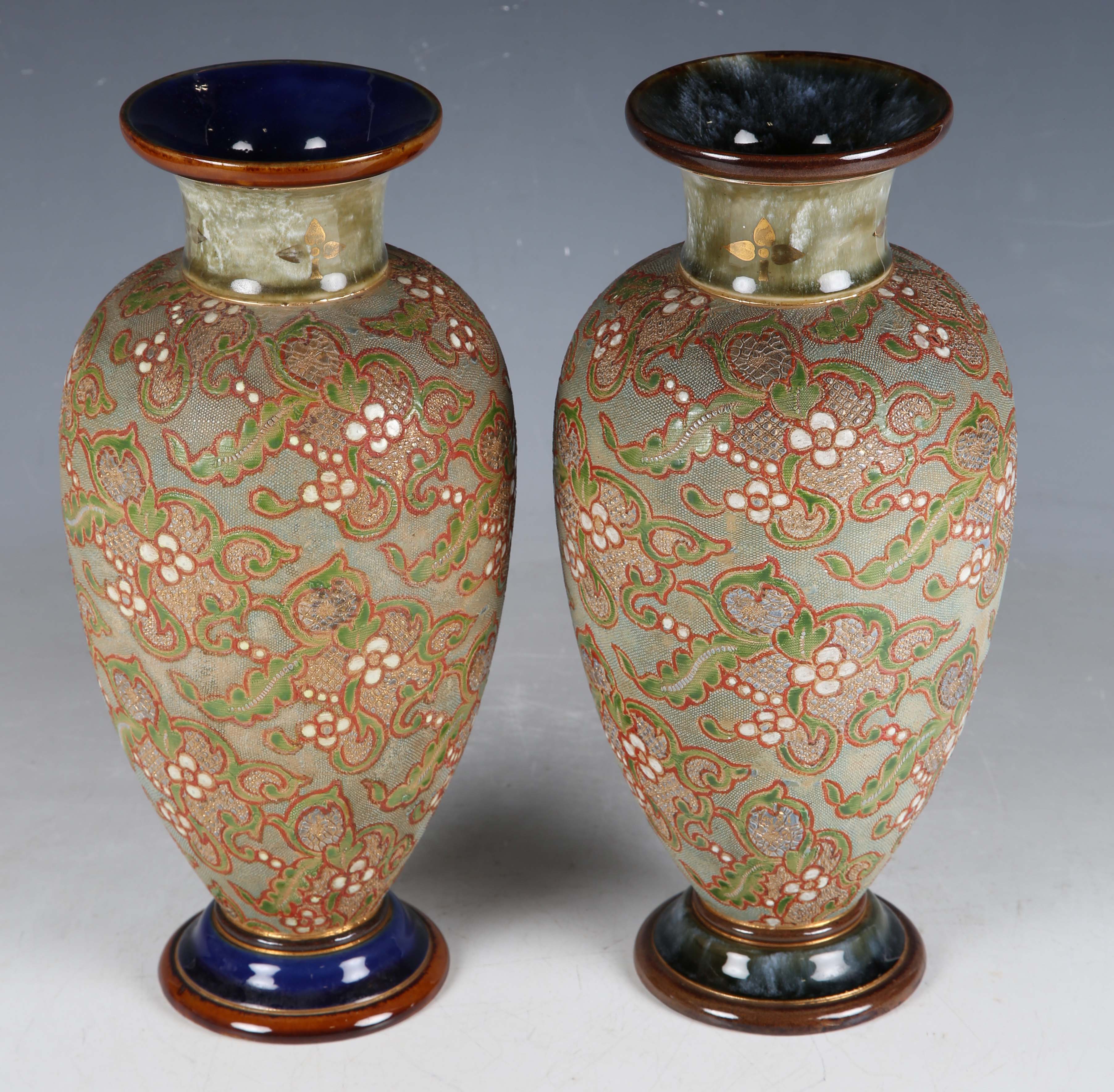 A matched pair of Royal Doulton Slaters Patent stoneware vases, early 20th century, decorated by Ethel Beard, monogrammed, with a foliate design against a textured ground, impressed and incised marks to bases, height 30cm.