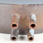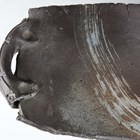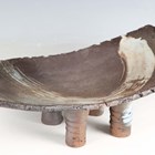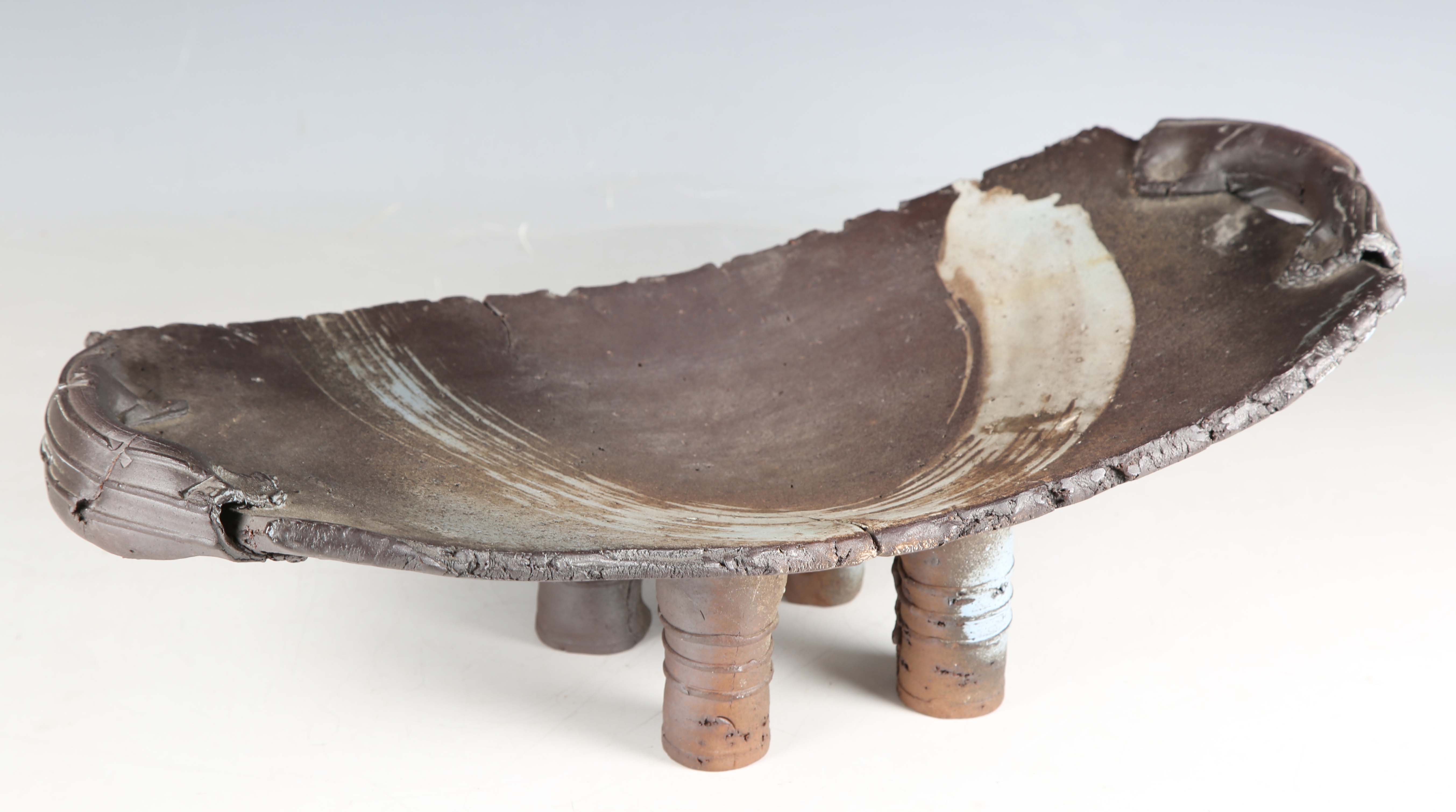 A brutalist studio pottery footed dish by Marcio Mattos, the rectangular slab top flanked by hollow handles, decorated with an arched brushstroke, raised on four tubular feet, incised and impressed marks to base, length 48cm.