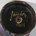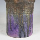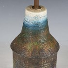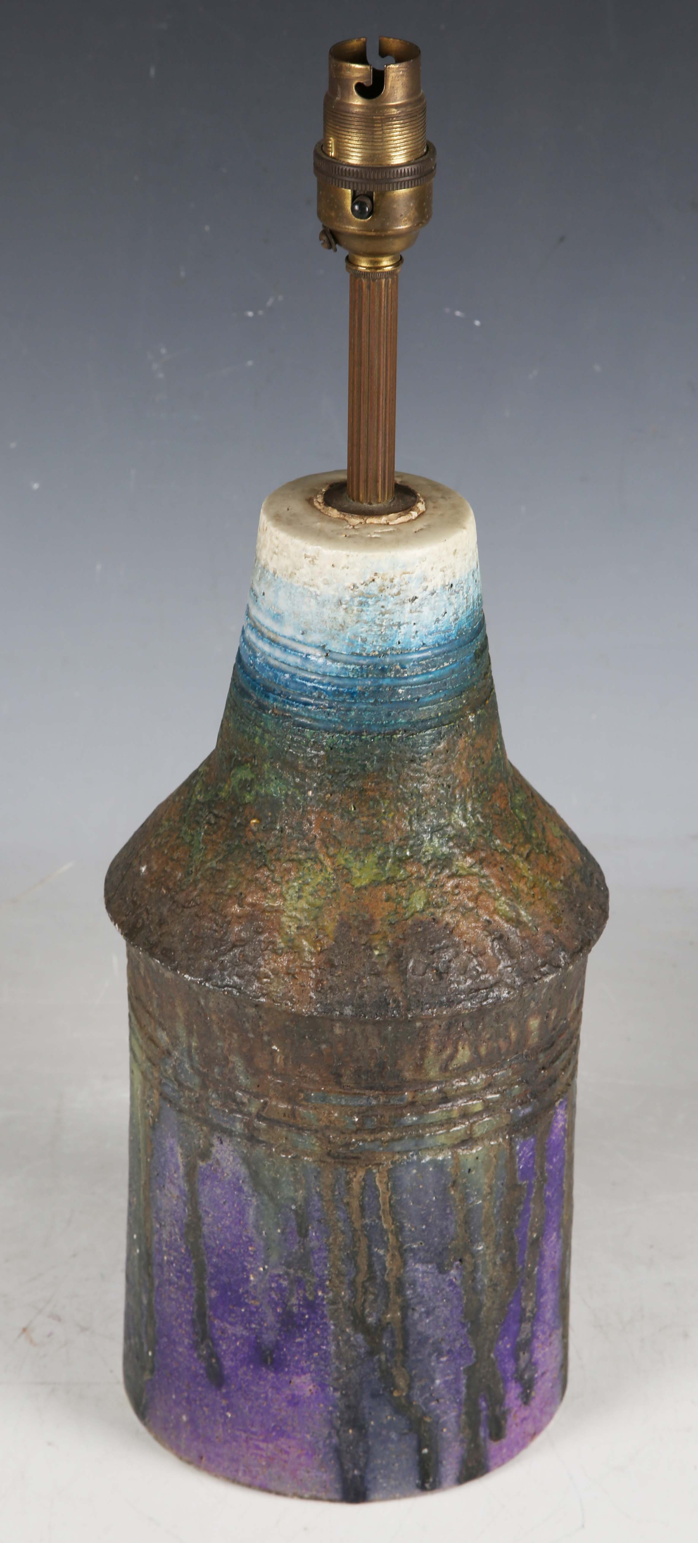 A Marcello Fantoni Italian pottery lampbase, circa 1960s, with textured surface, the neck and body incised with horizontal banding, covered in a dark running glaze over a shaded blue to purple ground, painted marks to base, height to top of fitting 41cm.