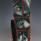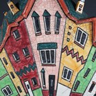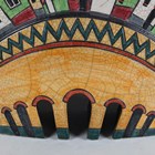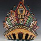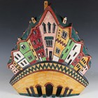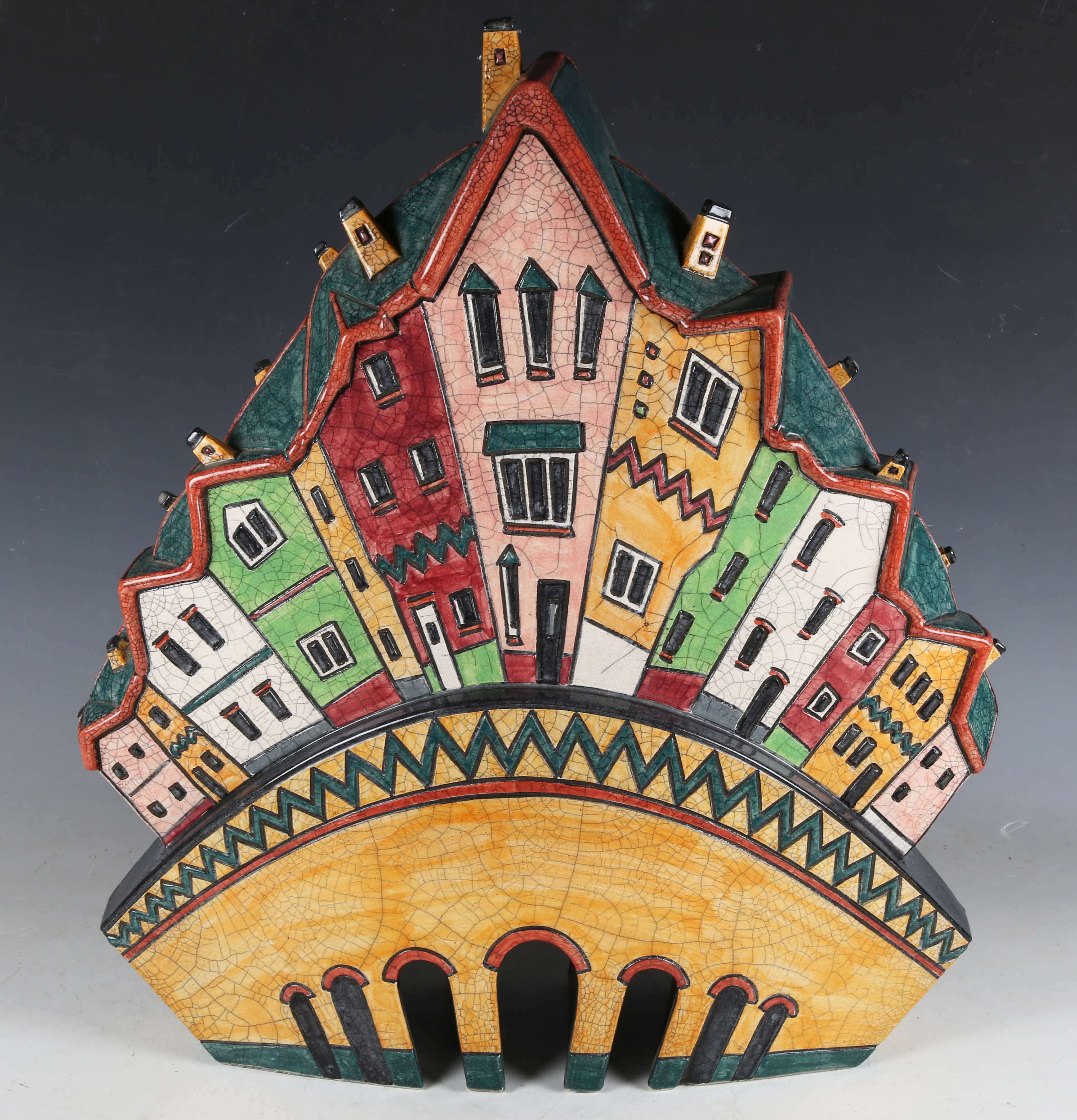 A large Andrew Osborne studio pottery raku fired model of a townscape, designed as an arrangement of colourfully painted terraced houses above a curved bridge with open arches beneath, decorated to both sides, incised mark to base, height 55cm.