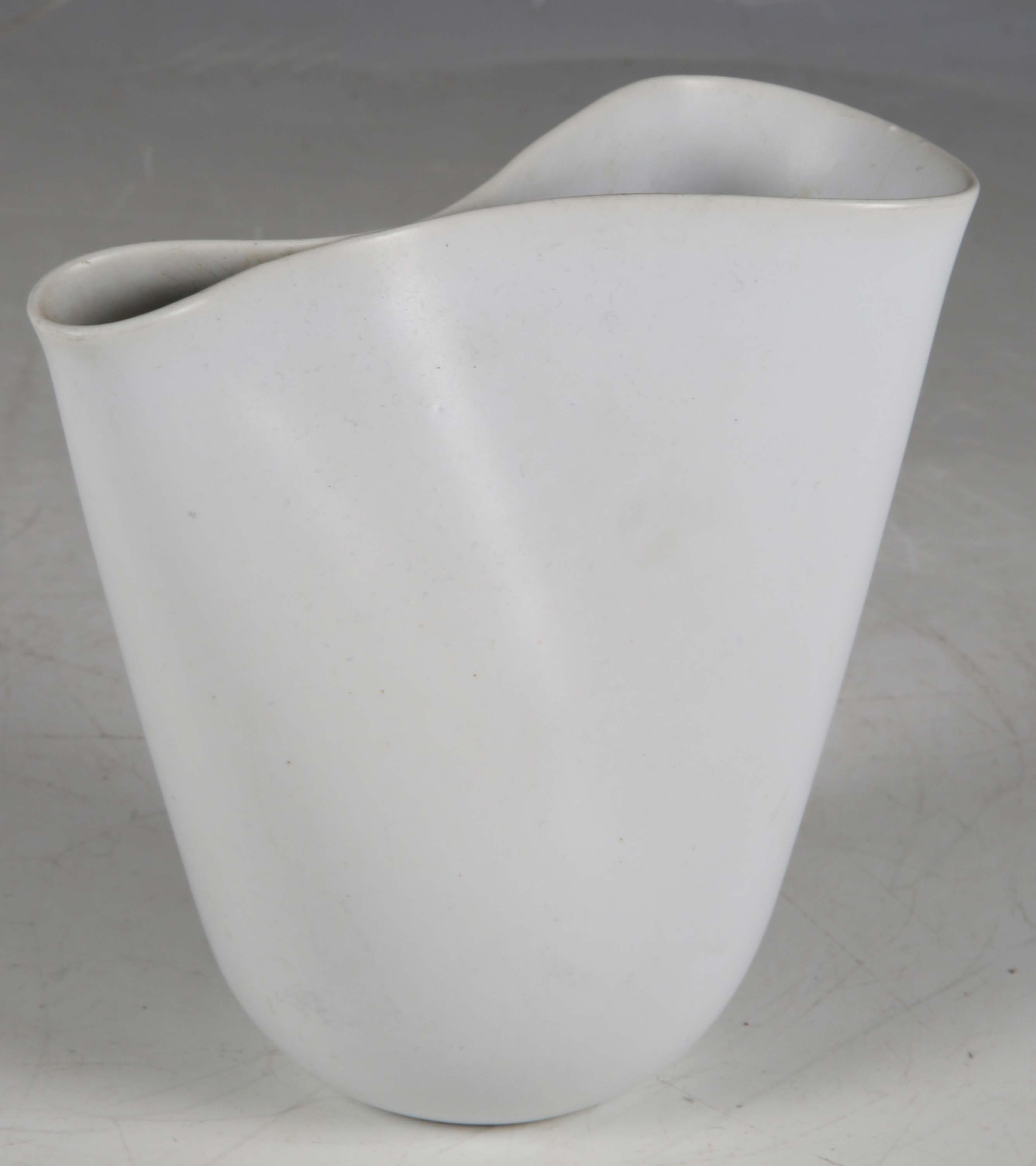 A Gustavsberg Veckla series Carrara glazed vase, designed by Stig Lindberg, circa 1950, shape 242, the stoneware body of free-formed shape with pinched rim, covered in a matt glaze, gilt printed marks to base, height 12.5cm.