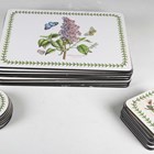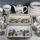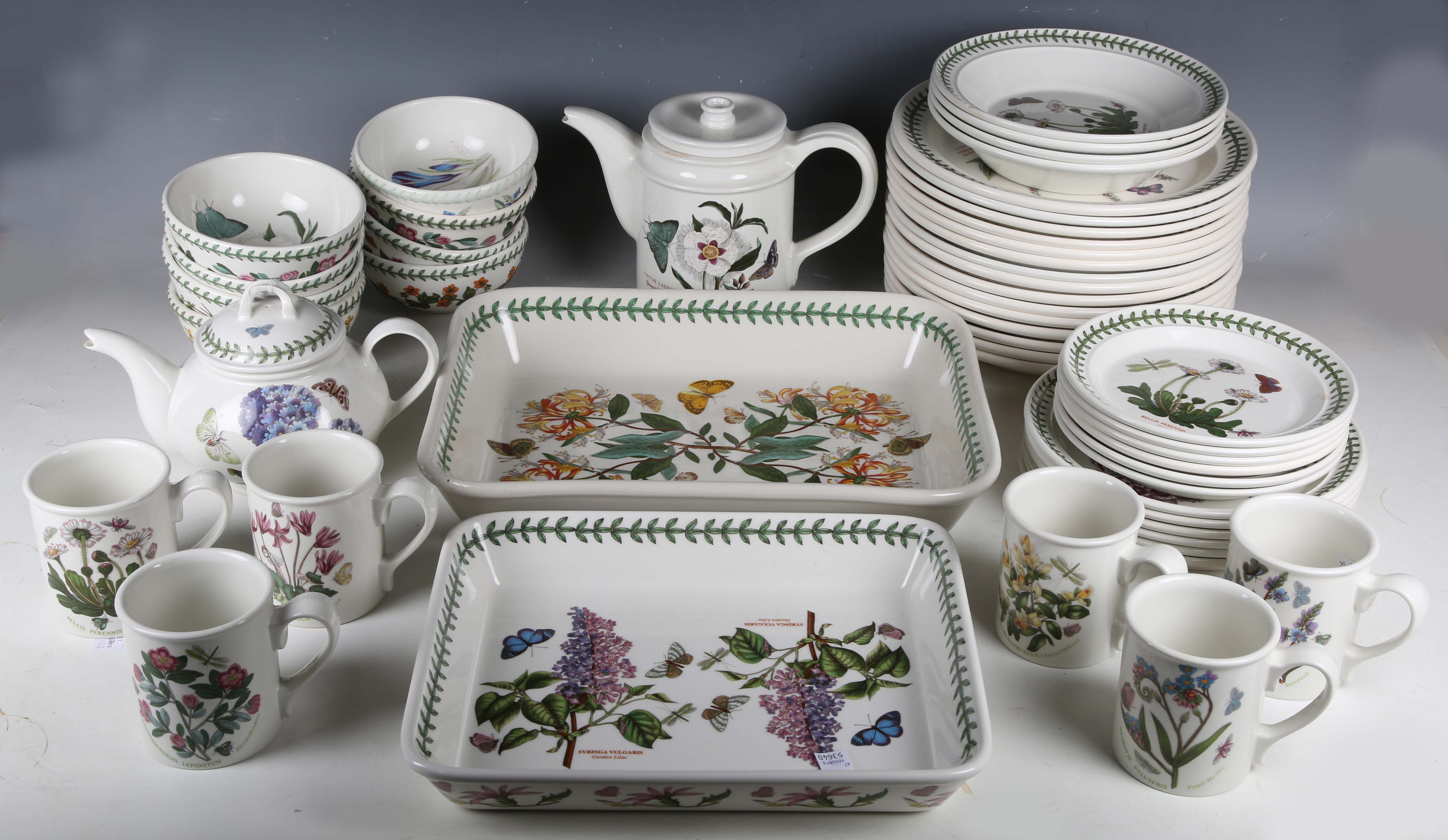 A group of Portmeirion Botanic Garden pattern tablewares, including an oval platter, length 48cm, a graduated pair of rectangular lasagne dishes, longest 37cm, three circular serving bowls, fifteen dinner plates, four soup plates, six dessert plates, six tea plates, eight cereal bowls, coffee pot and cover, teapot and cover, butter dish and cover, toast rack, six mugs, four teacups and saucers, milk jug, cream jug, set of four measuring cups, cruets and a quantity of placemats and coasters (some faults).