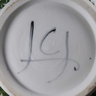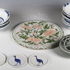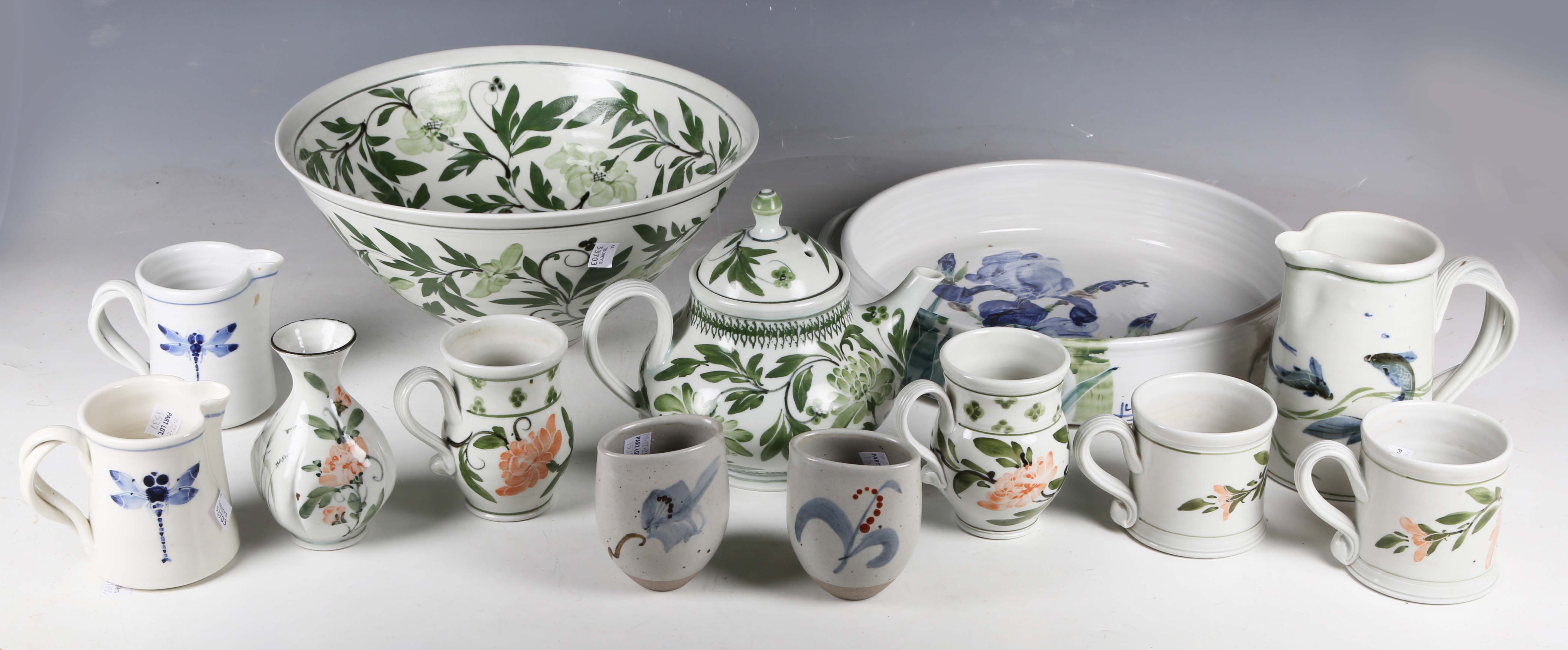 A group of Jonathan Chiswell Jones studio pottery tablewares, comprising a large flared circular bowl painted with green flowers and foliage, diameter 31cm, a floral painted cake platter, diameter 29.5cm, a circular two-handled dish painted with blue iris, diameter 30cm, teapot and cover, four mugs, a tall jug painted with fish and two smaller painted with dragonflies, eight cereal bowls painted with blue flowers, a vase, height 12cm, three coasters painted with birds and a celadon glazed potpourri bowl with pierced latticework cover, together with two Jonathan Chiswell Jones studio pottery stoneware yunomi, heights 8.5cm and 9cm.