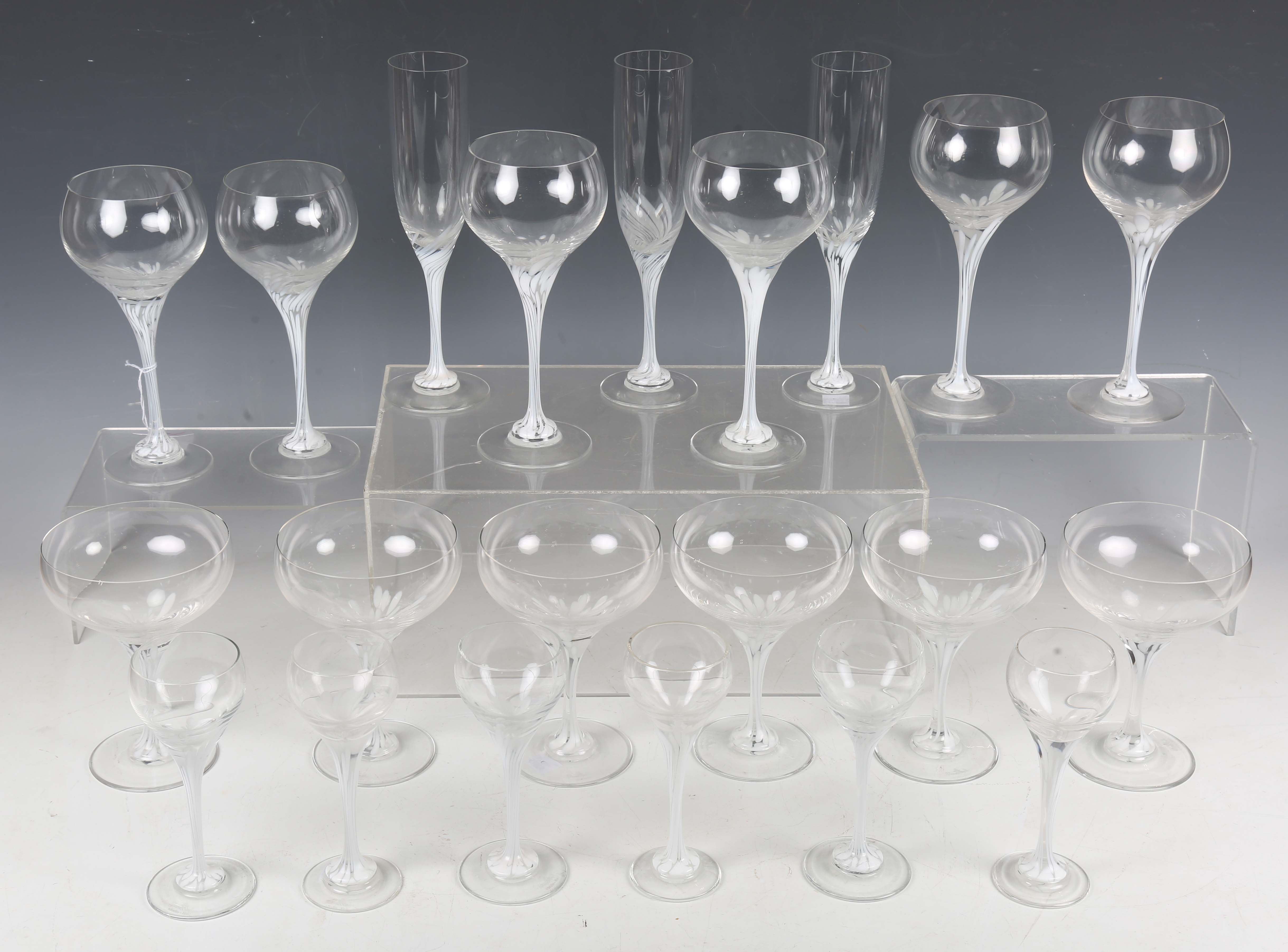 A Rosenthal Schneeblume (Snowflower) pattern part suite of glass, designed by Michael Boehm circa 1975-79, comprising six champagne saucers, height 15cm (one with minute nick to rim), six hock wines, height 20cm, six port, height 15cm, and three flutes, height 23cm, acid etched marks.