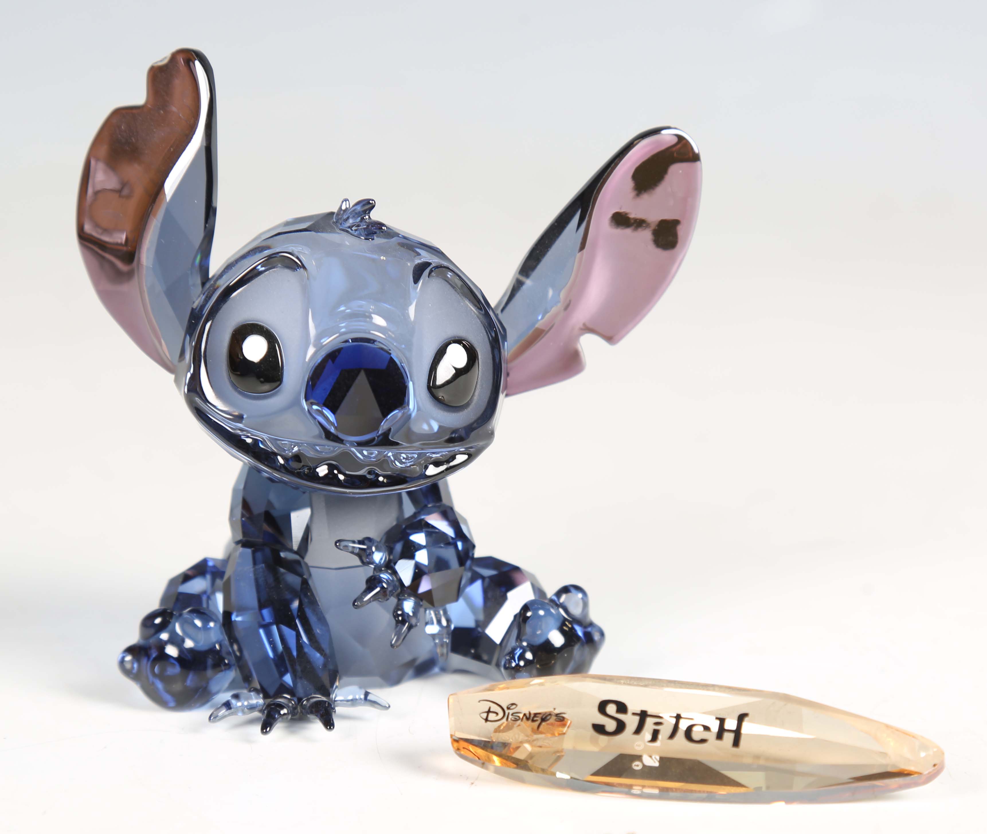 A Swarovski Disney model of Stitch, circa 2012, modelled seated with accompanying named surfboard, height of figure 8.5cm, length of surfboard 6cm, boxed (minor faults).