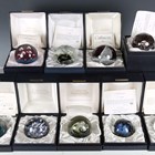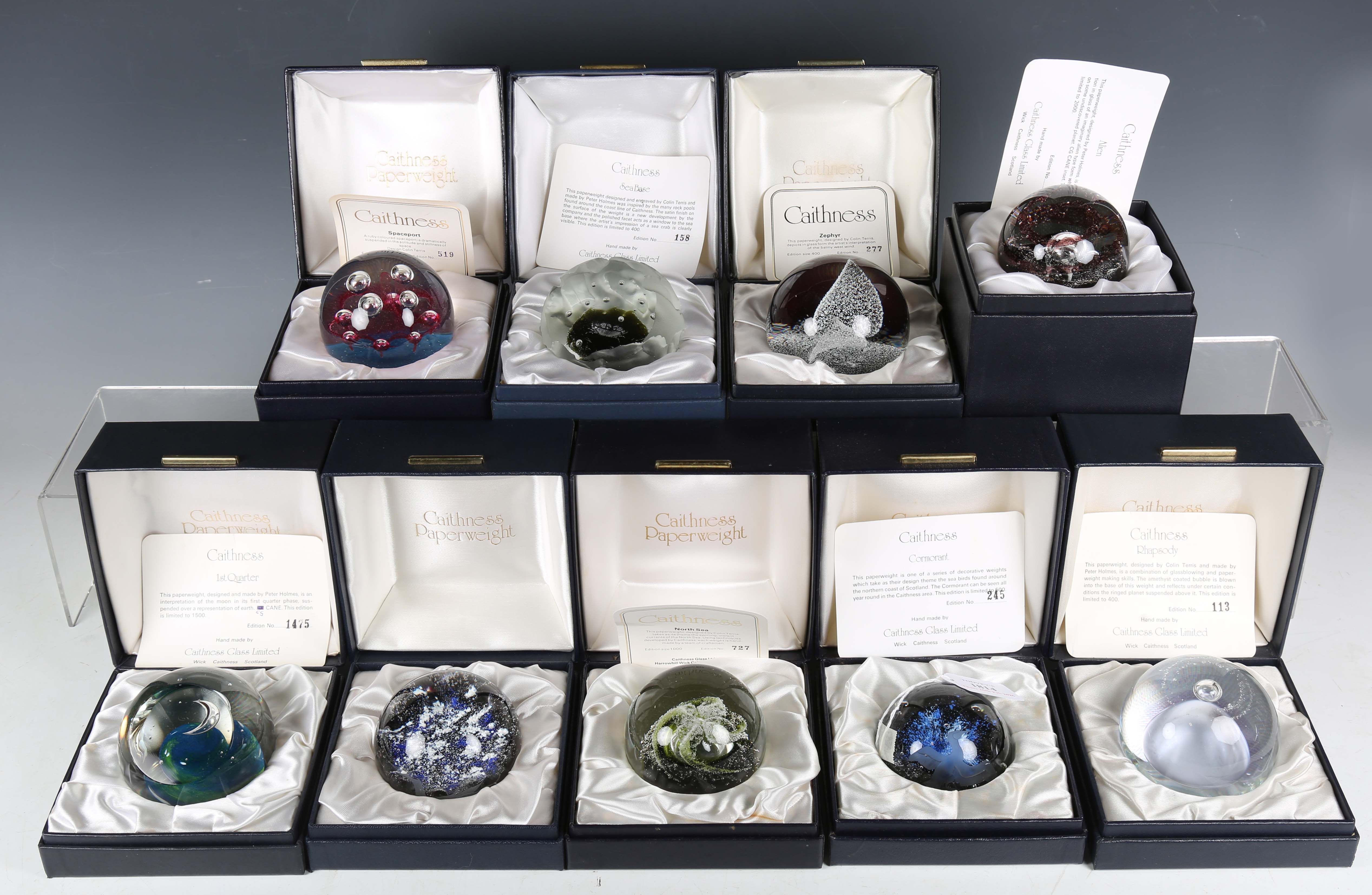 Eleven limited edition Caithness glass paperweights, comprising Cormorant, No. 245 of 500, Rhapsody designed by Colin Terris and made by Peter Holmes, No. 113 of 400, Zephyr, No. 277 of 400, Alien, No. 1489 of 2000, Spaceport, No. 519 of 1500, Sea Base, No. 158 of 400, 1st Quarter, No. 1475 of 1500, Intruder, No. 271 of 2000, North Sea, No. 727 of 1000, Guillemot, No. 103 of 500, and another from the Sea Birds series depicting a gull, No. 173 of 500, each boxed, nine with certificates.
