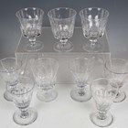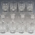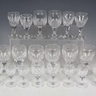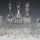 A set of eight Thomas Webb Royal Yacht pattern whisky tumblers, height 10.8cm, a small group of Royal Yacht pattern wine and liqueur glasses, and a group of other glass, including four large wines with bladed stems and star cut feet, height 13.5cm, a William Yeoward Pearl pattern decanter and stopper engraved in 18th century style, height 31cm, a decanter and stopper cut and polished with flowers and foliage, height 29cm (chip to foot), four other decanters and stoppers and four cut glass candlesticks, height 15cm.