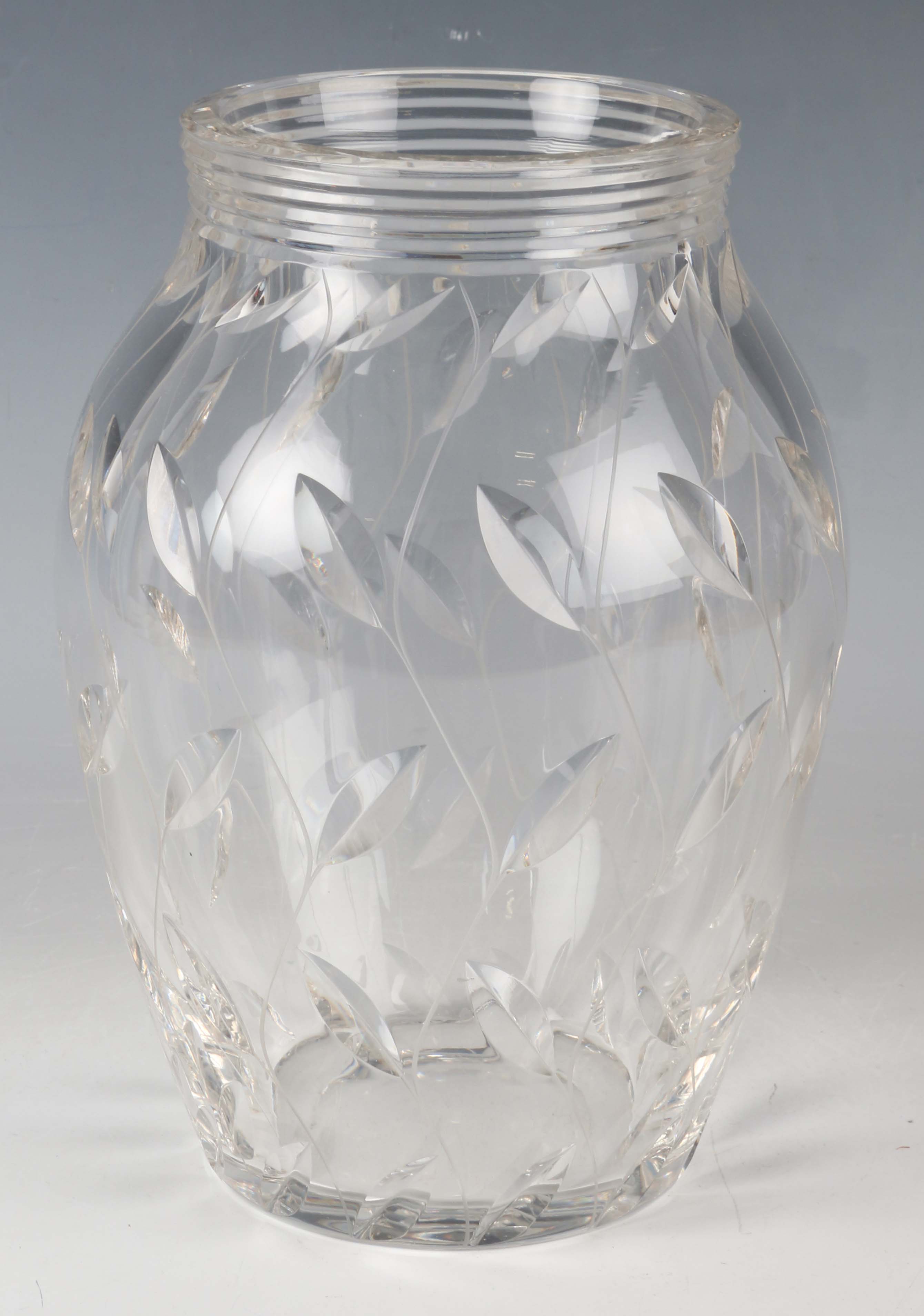 A John Walsh Walsh Leaf pattern cut glass vase, designed 1936 by Clyne Farquharson, engraved signature to base, height 20cm.