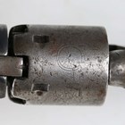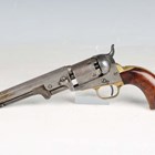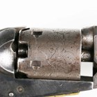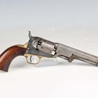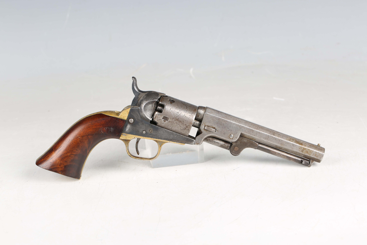 A mid to late 19th century United States Colt .36 five-shot percussion revolver, serial number 102880, with octagonal barrel, barrel length 12.5cm, marked 'Address Col Colt New York City', nipple foresight, round cylinder action, engraved with stagecoach scene and marked 'Colts Patent No 102830', the frame marked 'Colts Patent', brass trigger guard, figured walnut plate grips and hinged-action rammer, matching serial numbers throughout.