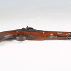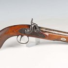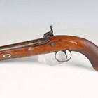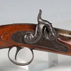 A fine late 18th/early 19th century percussion pistol by Egg & Sons, London, with sighted part-flattened round barrel, barrel length 15.5cm, foliate engraved hammer and line border engraved lock with foliate decoration, full-stocked with steel furniture, chequered grip and steel pull-out swing-over captive ramrod.