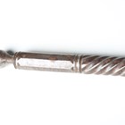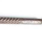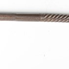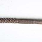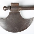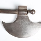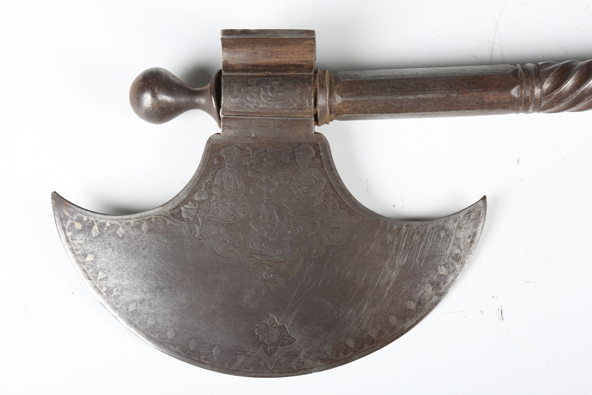 A 19th century Indian all-steel koftgari ceremonial axe, the crescent shaped blade with etched panel of figures amongst small plants and shrubs to each side, the socket section with panels of script, the shaft of part-twist and part-round faced sections, length 72cm.