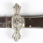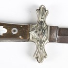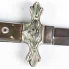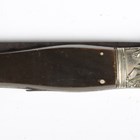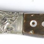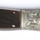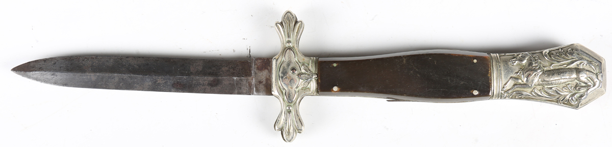 A rare late 19th century English, made for the American market, folding Bowie/RBD knife with double-edged blade, blade length 13cm, unmarked, pressed nickel shaped foliate crossguard, mother-of-pearl inlaid horn grips and pressed nickel shaped pommel, decorated with a stylized stretched alligator/horse-like creature (folding action defective).