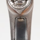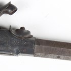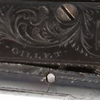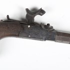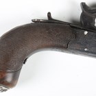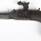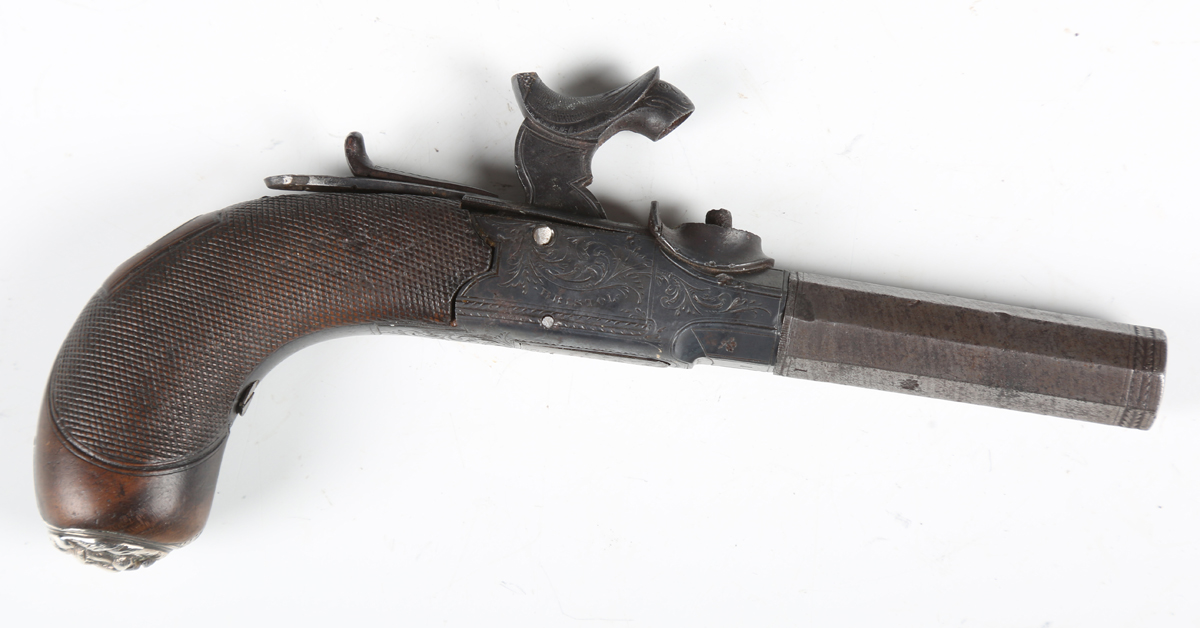 An early 19th century percussion pocket pistol by Gillet, Bristol, with octagonal turn-off barrel, barrel length 6cm, engraved foliate locks and hammer, sliding safety, spring-loaded trigger and finely chequered wood grip with applied lion mask butt (action defective, finger tap of hammer lacking).