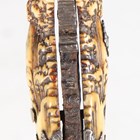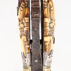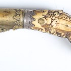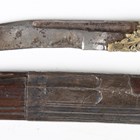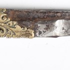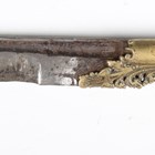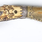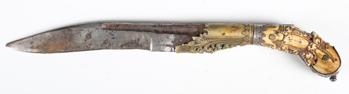 An 18th/19th century Sri Lankan piha kaetta knife with single-edged fullered blade, blade length 12cm, scrolling carved and chased brass foliate mount and ivory grip with finely carved foliate decoration and white metal mounts, with white metal mounted boarded wood scabbard (losses to lower portion of scabbard). Note: a non-transferrable ivory exemption certificate has been granted for the sale of this item.