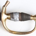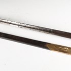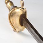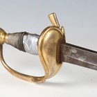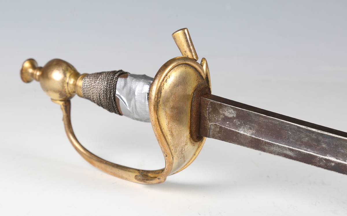 A Victorian 1796 pattern officer's dress sword by Hawkes of London, Manufacturers to the Queen, with single-edged fullered blade, blade length 88.5cm, gilt cast brass half-clamshell guard and knuckle bow, and white metal wire bound grip, with gilt brass mounted stitched leather scabbard, fitted with a hook (losses to grip wire, scabbard chape lacking, some evidence of poor cleaning of blade in the past).
