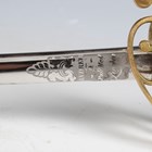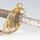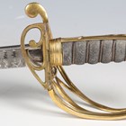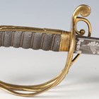 A William IV 1822 pattern officer's sword by Andrews, 9 Pall Mall, London, with curved pipe-back blade with quill point, blade length 82cm, etched with crowned 'WR' cypher and oak leaf sprays, gilt cast brass gothic hilt, the folding guard with oval cartouche with crowned 'WR' cypher, and wire bound fishskin grip, with gilt brass mounted stitched leather scabbard.