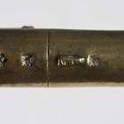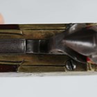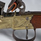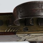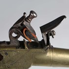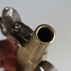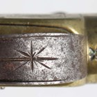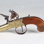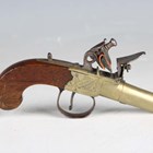 A late 18th century brass flintlock pistol by Clarke, London, with turn-off barrel, barrel length 4cm, line engraved locks, decorated with trophy of arms, steel trigger guard, sliding safety and plain wood grips (action works at half and full cock).