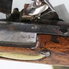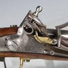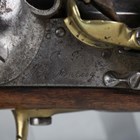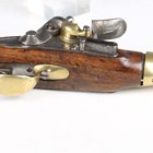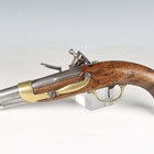 An early 19th century French model 1822 flintlock cavalry pistol from the Mutzig arsenal, with round barrel, barrel length 20cm, full-stocked with brass furniture, pull-out steel ramrod and lanyard ring to butt (action works at half and full cock).