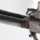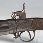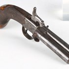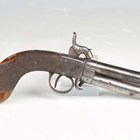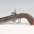 An unusual early 19th century percussion overcoat pistol with turn-over double barrel, barrel length 9cm, foliate engraved lock, stylized dolphin hammer and finely chequered walnut grip (action works, overall a clean gun).