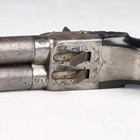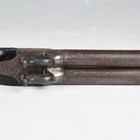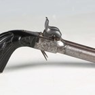 A 19th century European double-barrelled percussion pistol with side-by-side pattern welded round barrels, barrel length 7.5cm, foliate engraved locks, spring-loaded triggers, ebonized fluted grip, finely carved with bands of flowers, and nickel butt plate with percussion cap trap door (action part-working but a little stiff).