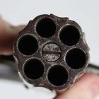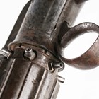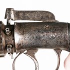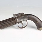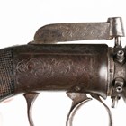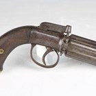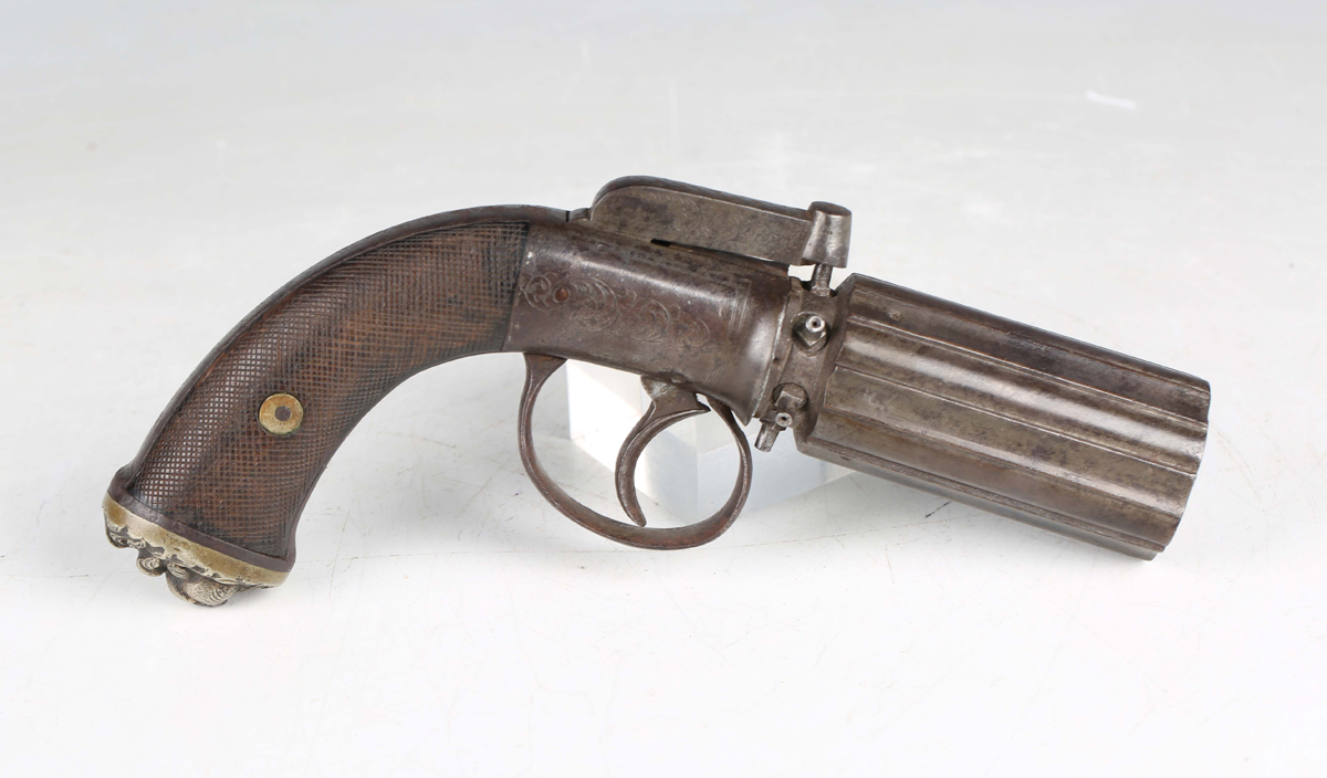 A fine mid-19th century 60-bore six-shot pepperbox percussion pistol by James Harper, probably James Harper of London, with fluted barrel, barrel length 9cm, foliate engraved locks and hammer, and finely chequered grip with white metal lion mask butt cap (action works).