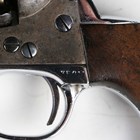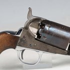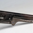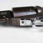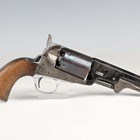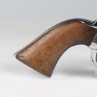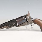 A United States Colt Brevete .35 six-shot percussion revolver, serial number 104637, with sighted octagonal barrel, barrel length 12.5cm, indistinctly detailed to top face 'Cap system manufactured by ???', engraved cylinder, faintly depicting a naval battle, pull-down rammer, unusual chrome finished trigger guard and wood plate grips (probably reblued and replated at some time).