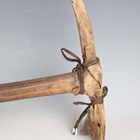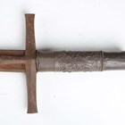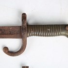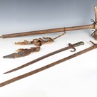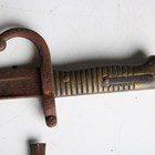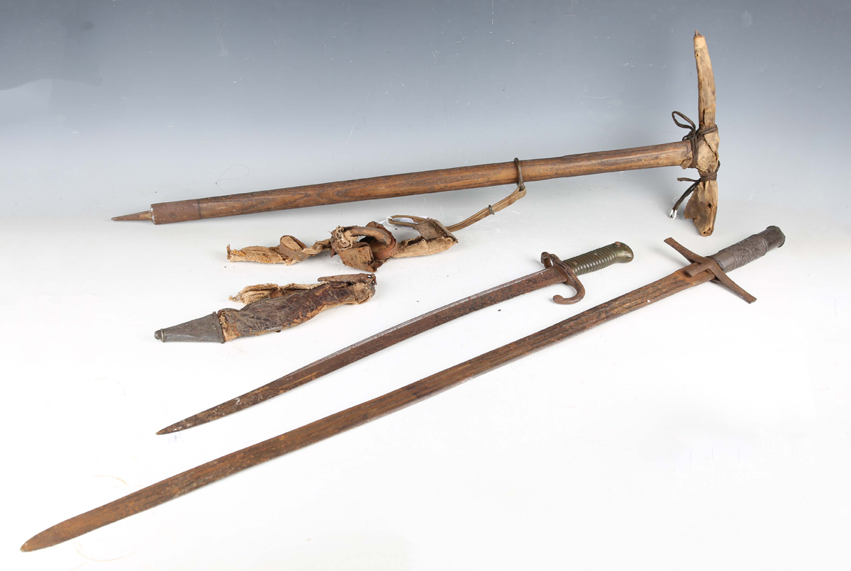 A late 19th century Sudanese kaskar sword with straight single-edged double-fullered blade, blade length 91cm, with short lines of text to narrow fullers, steel 'T'-shaped crossguard and embossed white metal applied grip, together with a French 1866 model Chassepot bayonet and an ice pick, possibly military issue, with web strap and sliding ring mount.