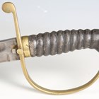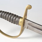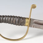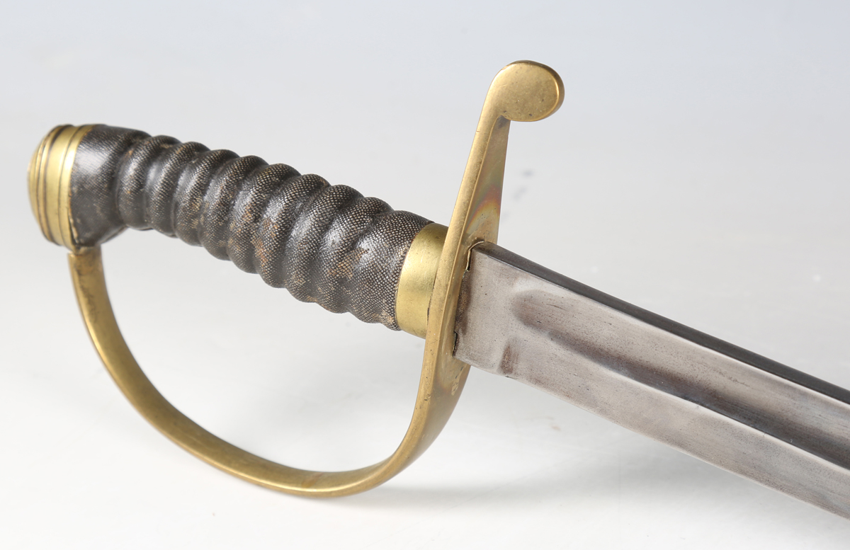 A Victorian constabulary shortsword with straight single-edged blade with quill point, blade length 57cm, 'D' shaped brass guard, fishskin grip and stepped pommel, with brass mounted stitched leather scabbard.