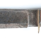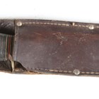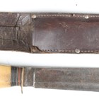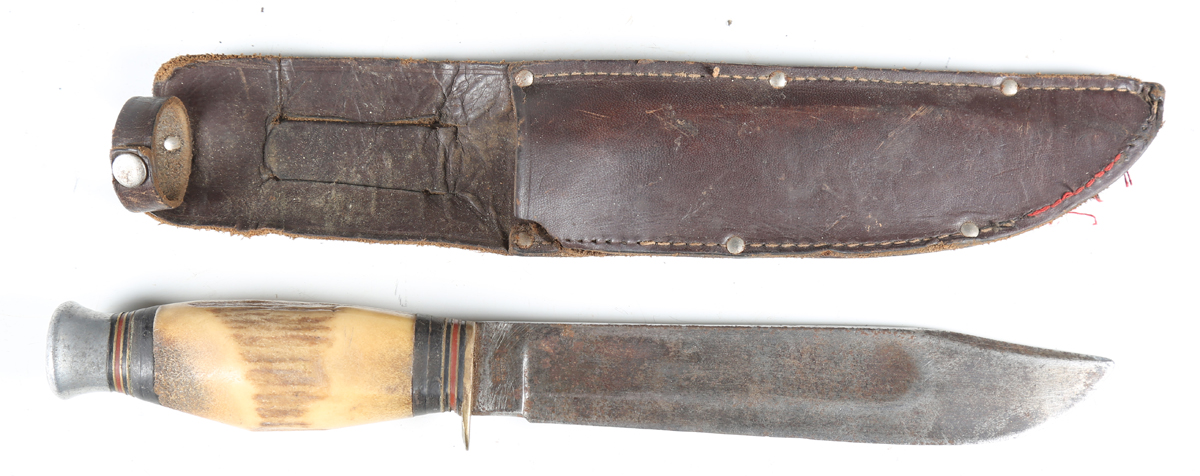 A mid-20th century Bowie/RBD hunting knife with wide-section single-edged clip-point blade, blade length 20cm, the ricasso marked 'William Rogers, I Cut My Way' and 'Made in Sheffield, England', and staghorn grip with composite banding and alloy pommel, with stitched leather scabbard.