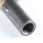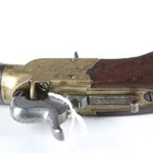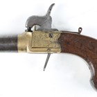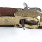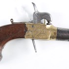 An early 19th century percussion pocket pistol, probably by Ketland & Co, London, with round turn-off barrel, barrel length 4.2cm, brass locks and body, engraved with trophies of arms, sliding steel safety, folding spring-loaded trigger and one-piece flat-sided wood grip with pokerwork decoration, initialled 'J.S.' (probably an old conversion from flintlock, action works at half and full cock, overall old restoration, wear and abrasion to brass locks).