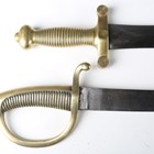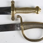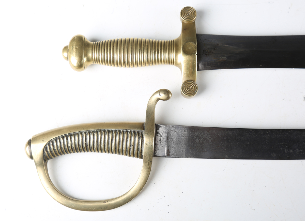 A French M1831 artillery gladius sidearm by Talabot, Paris, with straight double-edged leaf-shaped blade, blade length 48.5cm, and cast brass one-piece grip, with brass mounted leather scabbard (repaired), together with a 19th century briquet with slightly curved single-edged blade and cast brass one-piece grip and knuckle guard.
