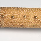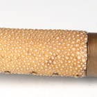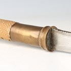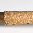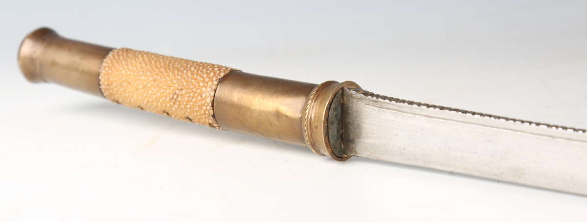 A late 19th century Burmese dha with fine slightly curved single-edged blade, blade length 62cm, with single-full-length narrow fuller and triangular clip point, the back face edge with part-grooved chequer finish, and brass mounted and part-fishskin studded grip, with brass bound two-section hardwood scabbard.