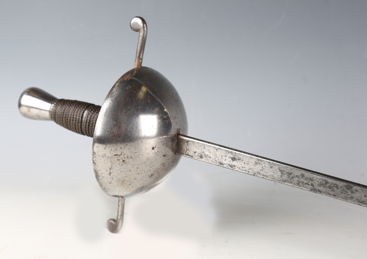 An unusual all-steel cup-hilted sparring rapier by Wilkinson, with straight blunted blade, blade length 114cm, the ricasso marked 'Wilkinson, Pall Mall, London', cup bowl, crosspiece guard, wire bound grip and shaped pommel.