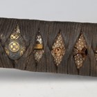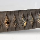 A late 19th century Japanese wakizashi with curved single-edged blade, blade length 46.5cm, the tang unsigned, and fabric tape bound fishskin grip with hidden gilt menuki, with composite formed shagreen/fishskin covered wood scabbard (lacking tsuba, blade with some active rust, overall environmental damage and losses).